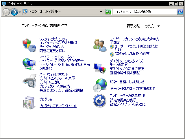 | 4. | Windowsのコントロール パネルが表示されたら、「プログラムのアンインストール」(Windows