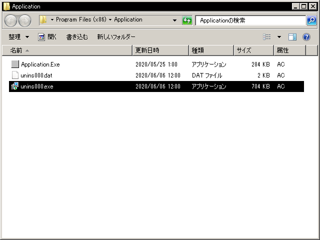 | 4. | 製品をインストールしたディレクトリ(フォルダ)が開いたら、「unins000.exe」という名前のプログラムファイル(アンインストーラ)を探し、起動させてください。
