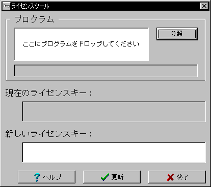 製品に設定されている「現在のライセンスキー」は、弊社の配布しているライセンス設定ツール「ライセンスツール」を使い、製品のプログラムファイルから取得することができます。詳しくは「ライセンスツール」の取り扱い説明書をご覧ください。