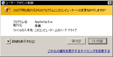 | 2. | 「ユーザー アカウント制御」ダイアログが表示されたら、「はい」ボタンを押してください。