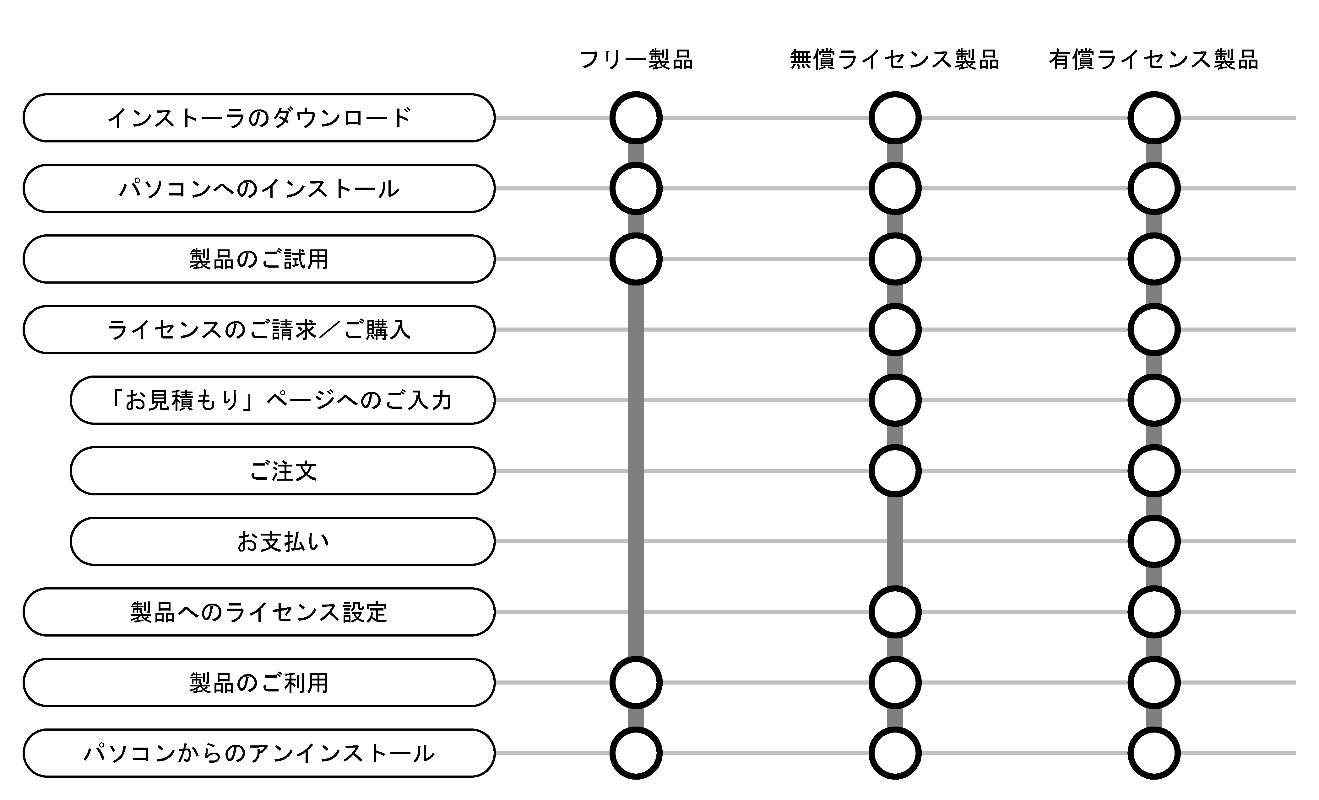 | 7 | 製品へのライセンスの設定 | 弊社からお客様に、ご請求/ご購入いただいたライセンスをメールでお届けいたします。お手もとに届きましたら、インストール済みの製品に設定してください。これで手続きは終わりです。 | ||