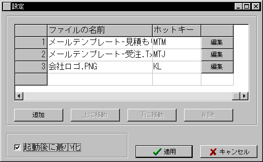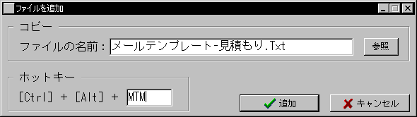 | 「秒速コピー」は、テキストファイルや画像ファイルの内容を、簡単なホットキー操作でクリップボードにコピーすることのできるソフトウェアです。CtrlキーとAltキーを押しながら、1〜6文字の英数字キーを押すだけで、あらかじめ指定しておいたファイルの内容をコピーします。ファイルそのものではなく、その内容をクリップボードにコピーすることができます。「メモ帳」などのテキストエディタや、「ペイントブラシ」などの画像編集ソフトウェアでファイルを開いてコピーするのに比べると、とても簡単な操作です。メールに貼り付ける定型の文章や送信先ごとの署名、プレゼンテーションの各ページに貼り付けるロゴマークなど、ワンタッチでコピーし、すぐお使いいただけます。 | ||