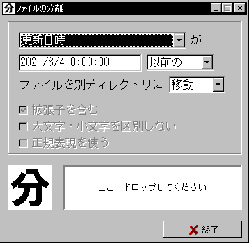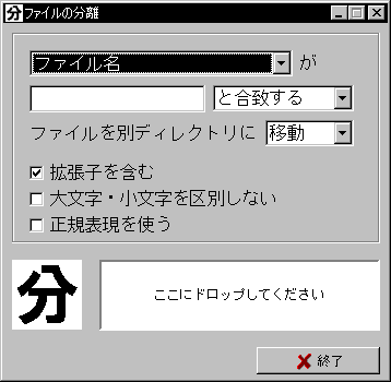 | 「FileSeparate」は、指定した分別条件を満たすファイルを、ディレクトリ階層を保ったまま取り出すことができるソフトウェアです。多くのファイルの中から、名前に特定の文字列が含まれるファイルだけを取り出したり、逃がしたりすることができます。たとえば「テキストファイルだけをUSBディスクにバックアップしたい」といった場合、ファイル名に「.txt」という文字列が含まれているファイルだけを別のディレクトリに取り出してからバックアップすることができます。また「ファイルの内容をキーワードで検索したいが、古いファイルは除外したい」といった場合、ファイル名やディレクトリ名に「古い」という文字列が含まれているファイルを別のディレクトリに逃がしておいてからキーワード検索をかけることもできます。分別条件の指定にはファイルの名前だけでなく、更新日時やサイズを使うこともできます。「FileSeparate」ではディレクトリ階層も保たれますから、一時的に逃がしたファイルをもとに戻すことができますし、異なるディレクトリに同名のファイルがあっても上書きされず、すべてのファイルが保存されます。 | ||