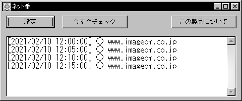 | 「ネット番」は、お使いのパソコンがインターネットに接続されているかどうかを継続的に調べて記録するソフトウェアです。あらかじめ指定した外部のウェブサーバに接続を試み、その成否によってインターネット接続を判定します。ネットワーク環境や通信機器の不調が疑われる時、その原因を突き止めるのにお役立ていただけます。また常時インターネットに接続させておきたいパソコンが切断された時、音を鳴らして知らせることもできます。自宅サーバをお使いの方や、ネットワーク管理に携わる方には、何かと役立つ便利ツールです。 | ||