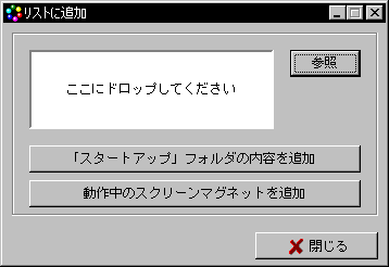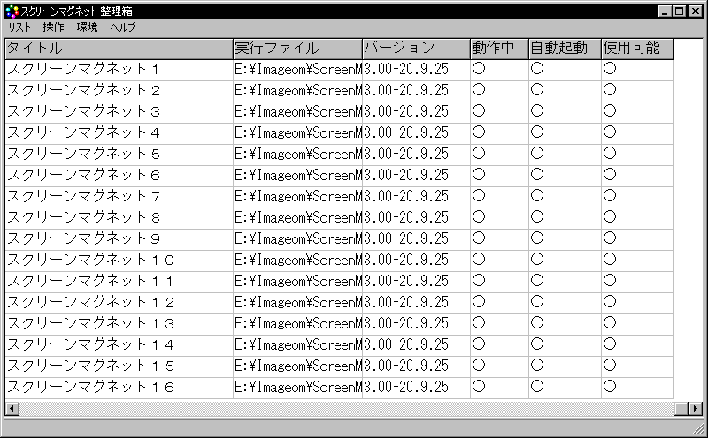 ![]() (クリックして拡大) メインウィンドウ ![]() (クリックして拡大) 「リストに追加」ウィンドウ ![]() (クリックして拡大) 「自動起動登録」ウィンドウ ![]() (クリックして拡大) 「バージョンアップ」ウィンドウ |