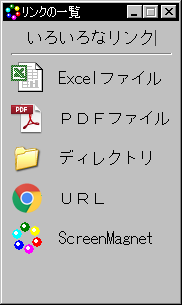 ![]() (クリックして拡大) さまざまなデザインのマグネットウィンドウ ![]() (クリックして拡大) 「リンクの一覧」ウィンドウ ![]() (クリックして拡大) 「リンクのプロパティ」ウィンドウ |