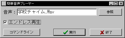 | 「簡単音声プレーヤー」は、指定した音声ファイルを再生することのできるシンプルなプレーヤー。終わりのないループ(繰り返し)再生もできます。自動実行に適したバッチファイルを作る機能も付属しており、応用自在。音楽をかけたり、通知音を鳴らしたり、いろいろご活用いただけます。 | ||