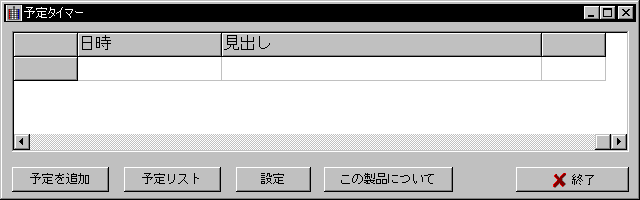 ![]() (クリックして拡大) メインウィンドウ ![]() (クリックして拡大) 予定ウィンドウ |