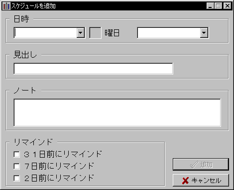 | 「予定タイマー」は、あらかじめ登録しておいた日時を音とダイアログで知らせるタイマーです。数週間後〜数年後の遠い予定を登録することを想定し、1ヶ月前から最大6回のリマインド(予定を思い出してもらうための通知)を行い、予定の忘れを防ぎます。またリマインドの際にスケジュールを変更し、再登録することも簡単にできますので、まだ詳細な日時が決まっていない予定も登録していただけます。「予定タイマー」をパソコンと同時に起動するように設定しておけば、あなたの心強い秘書になってくれることでしょう。 | ||